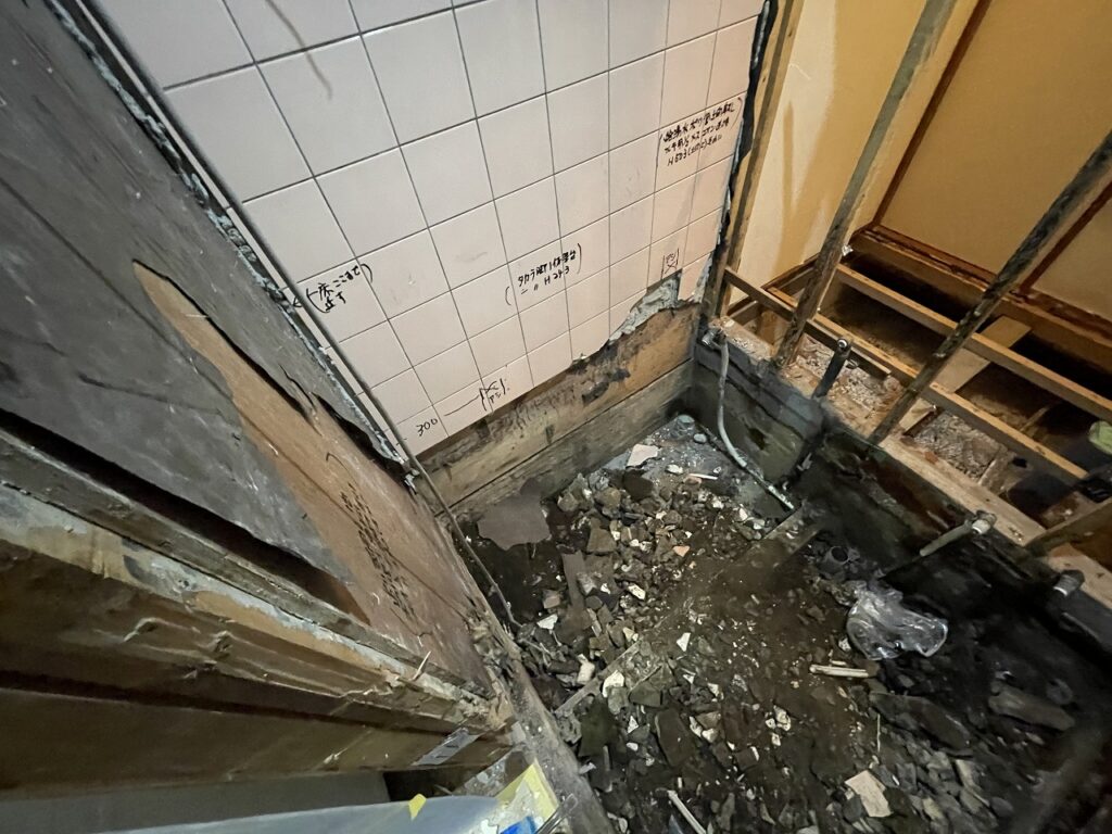 浴室の隣のトイレの壁が湿気で傷んでいました。原因の一つ浴室からの湿気を解決すべく、在来浴室からユニットバスへリフォームです。